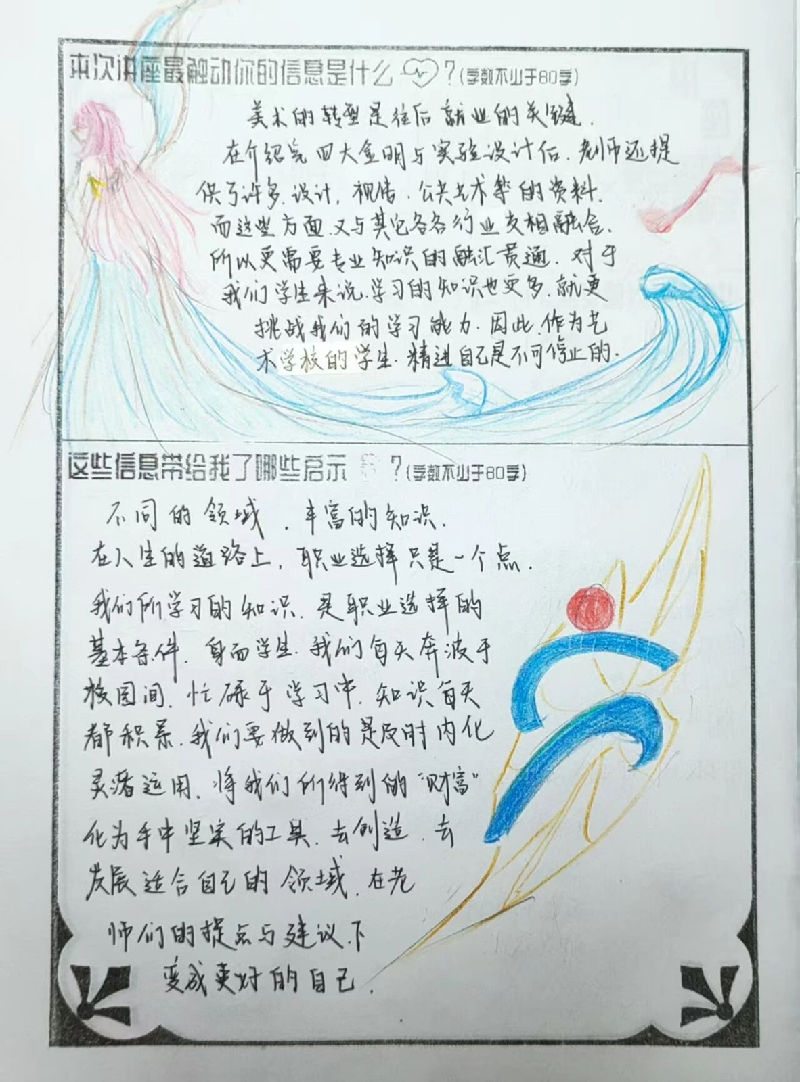 此外,毕老师结合美术行业的发展趋势,分析了近年来热门专业的就业方向,并在讲座最后向有意报考美术专业的同学提出建议:在夯实美术基本功的同时,应注重文化课学习,全面提升综合竞争力;及时关注各高校招生信息,深入了解专业录取规则;积极参加各类艺术实践活动,丰富创作经验,逐步明确个人的艺术兴趣与发展路径。