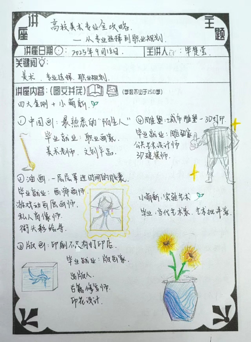 2025年9月18日下午,学校面向高二年级开展了本学期首场“大艺术讲座”。本次讲座由我校毕楚莹老师主讲,她聚焦高校美术专业介绍,为同学们深入解析了艺术院校与综合类大学美术专业的学习内容与未来职业的可选择方向。