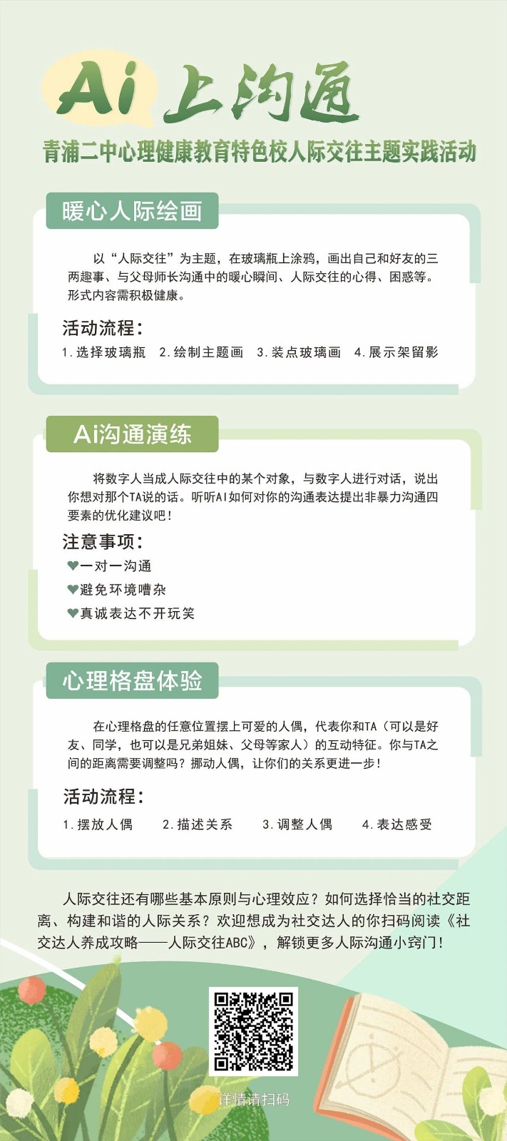 为进一步推进青浦区初高中心理健康教育工作的创新发展,探索 AI 与人际交往教育的深度融合,2025年 9月25日,以“AI 沟通”为主题的2025学年第一学期青浦区初高中心理健康教育研修活动在我校成功举办。本次活动汇聚了青浦区各初高中心理老师、35 号 & 36 号种子计划团队成员及青浦二中师生。通过前期创意赋能、现场多元体验与专业研讨交流,为参与师生搭建了一个学习、分享与实践的平台。